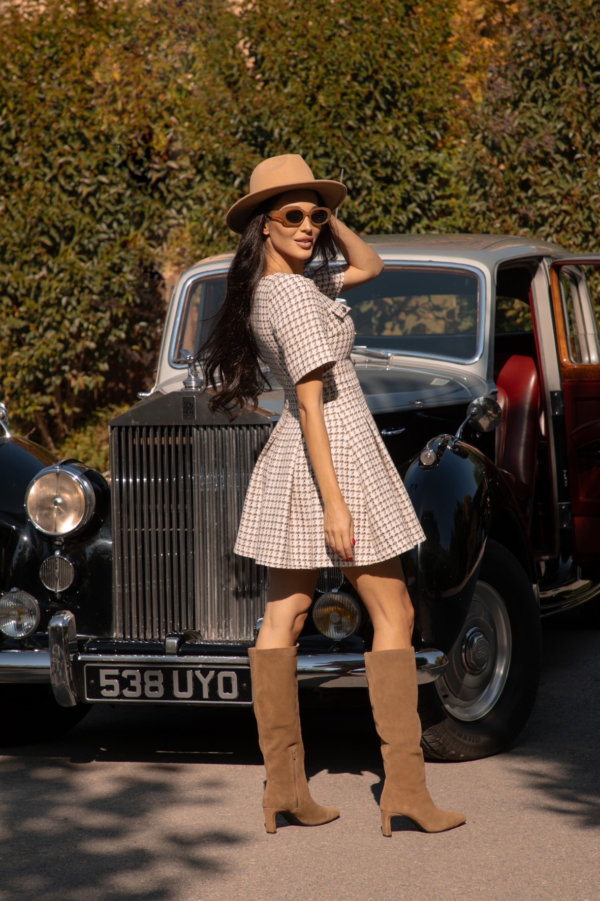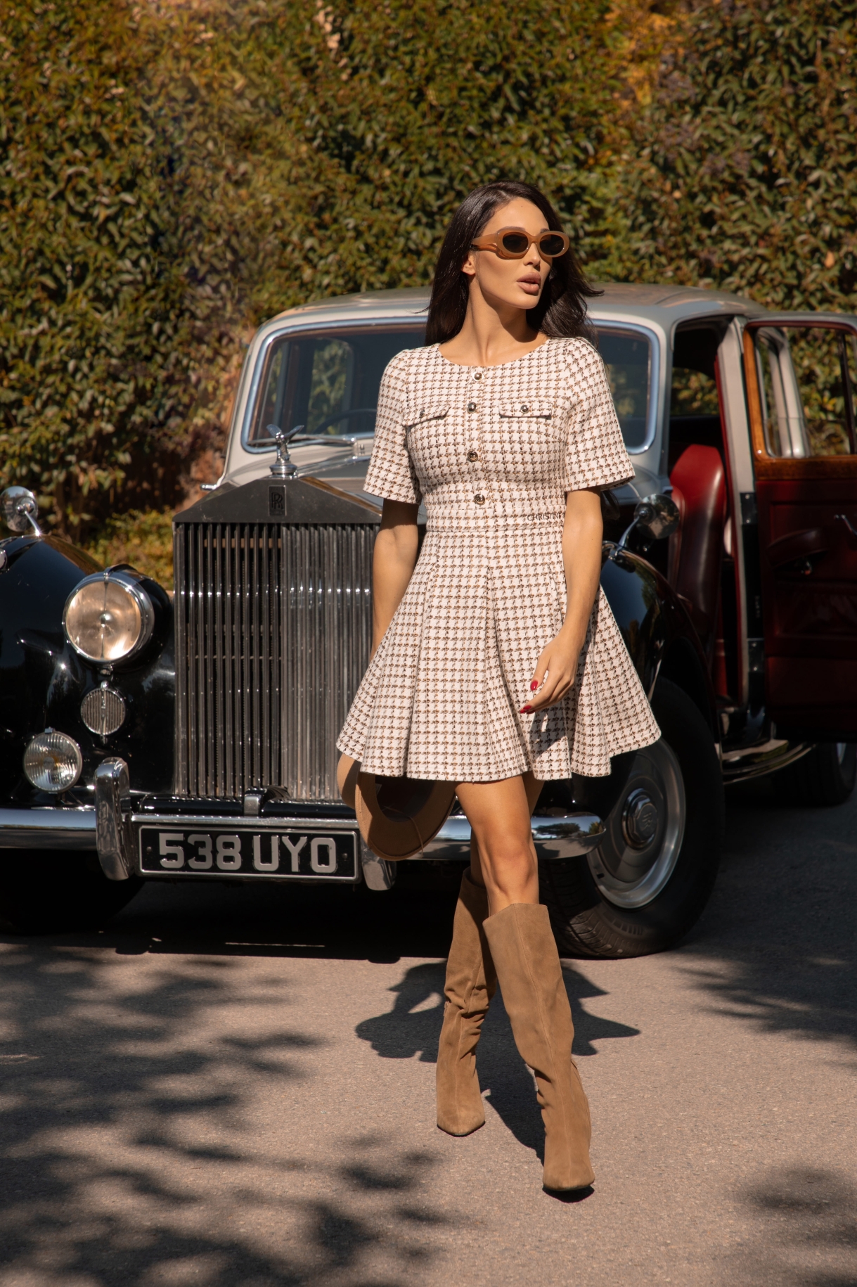 Рокля от букле с ръкави, обло деколте и долна част с плохи. Моделът е изработен от италианско букле в бяло и кафяво, изцяло подплатена с луксозна брандирана подплата. Роклята е декорирана с нежна бродерия CHRISTINE на талията, капаци и метални златисти копчета с лого. Закопчаване в задната част със скрит "YKK" цип.