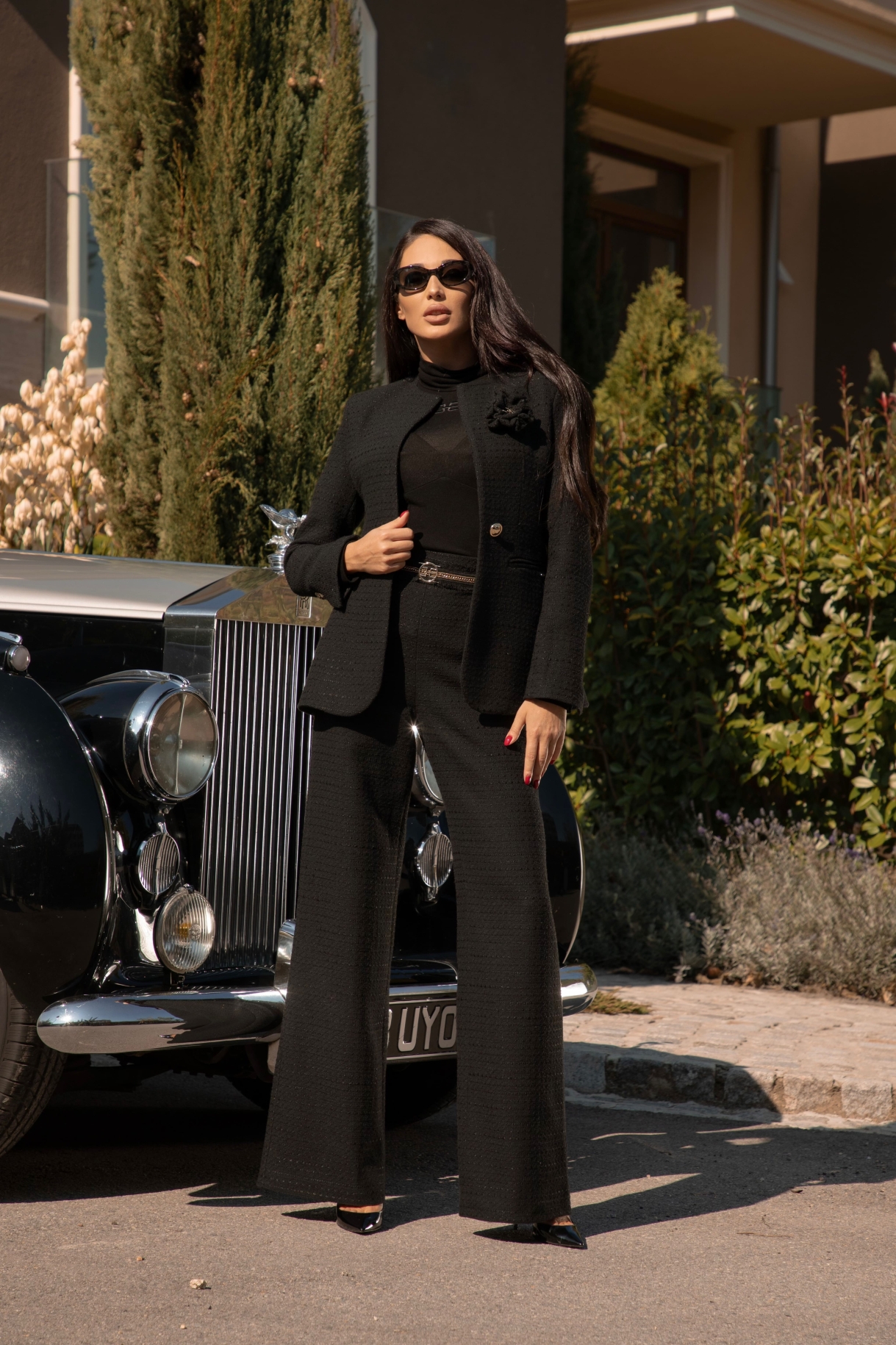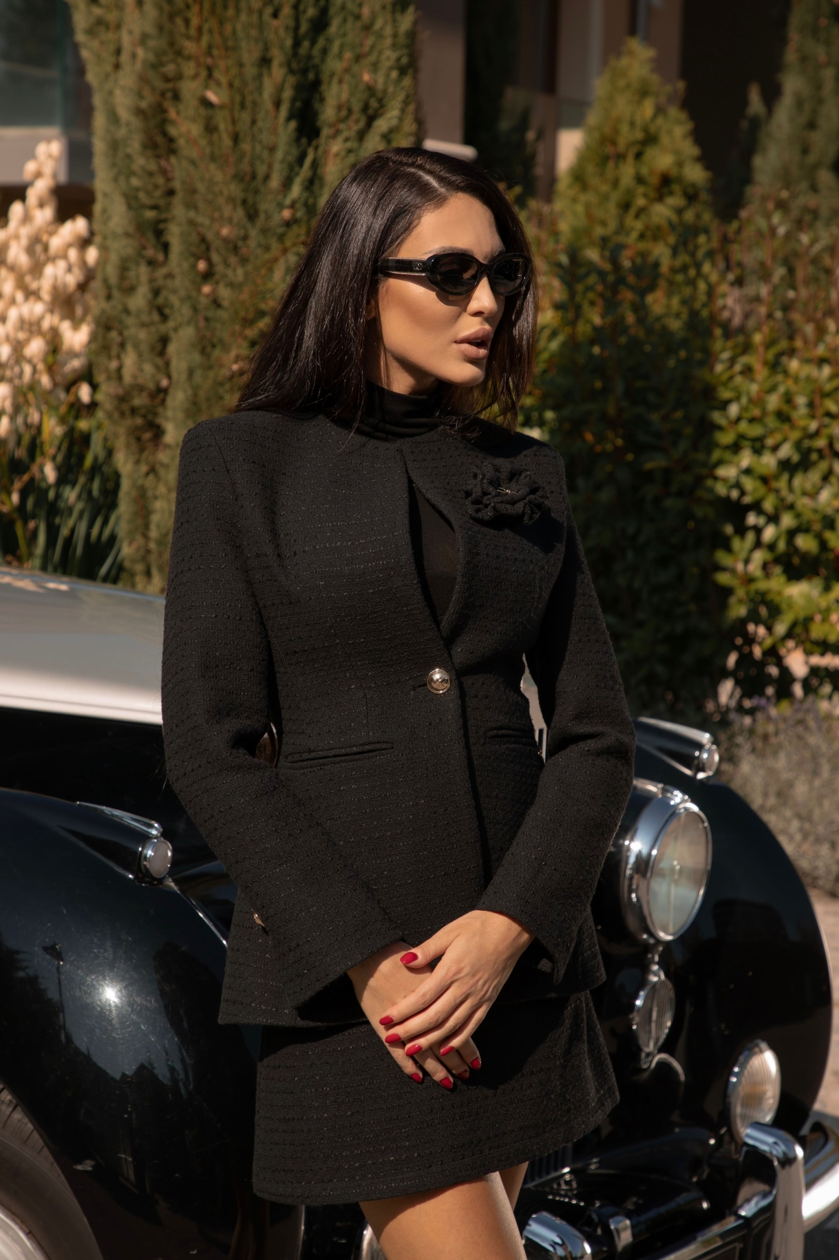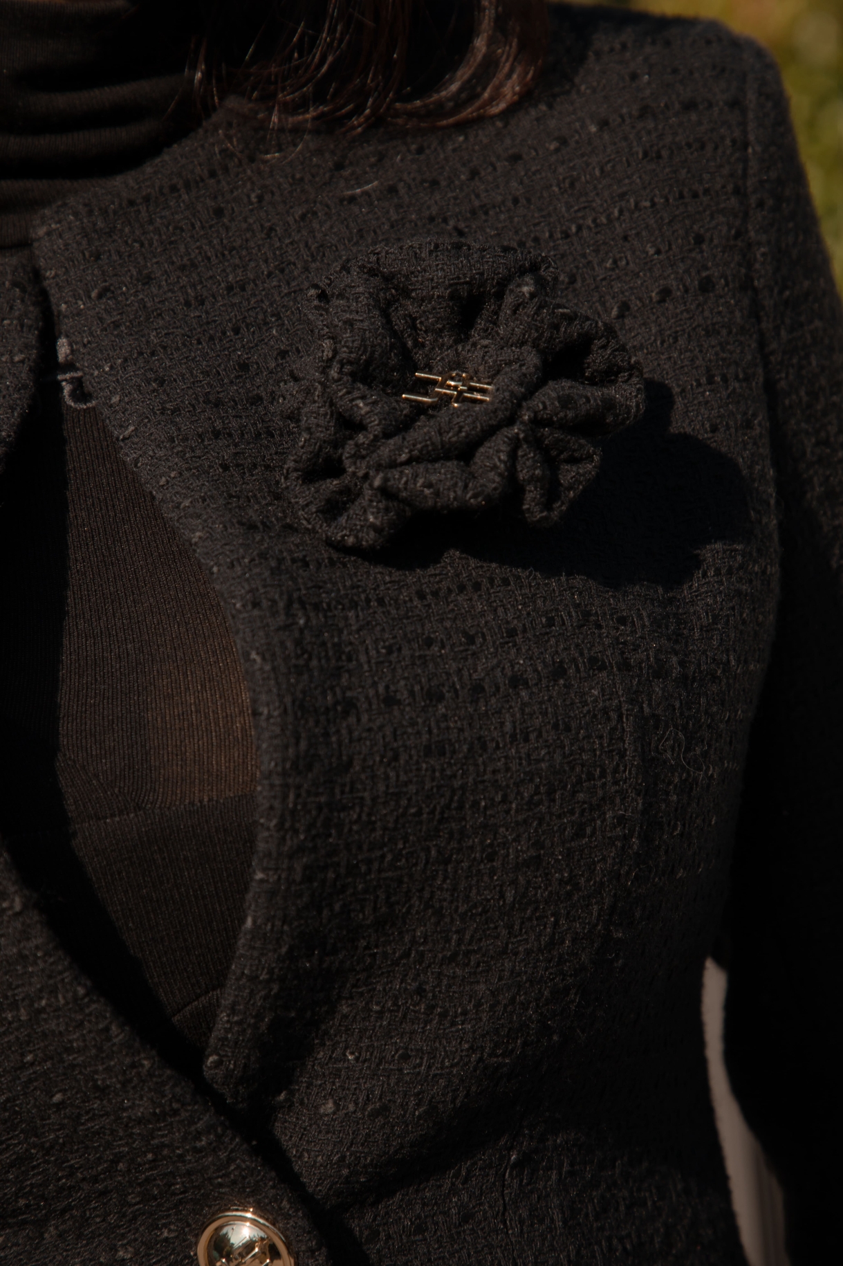 Черно сако изработено от плътно и нежно букле с луксозна брандирана подплата декорирано с ръчно изработена брошка от основния плат с метално златисто лого. Моделът е с втален силует и джобове с филетки. Сакото е с едноредно закопчаване в предната част, отворен шлиц на ръкава и метални копчета в златисто с лого.