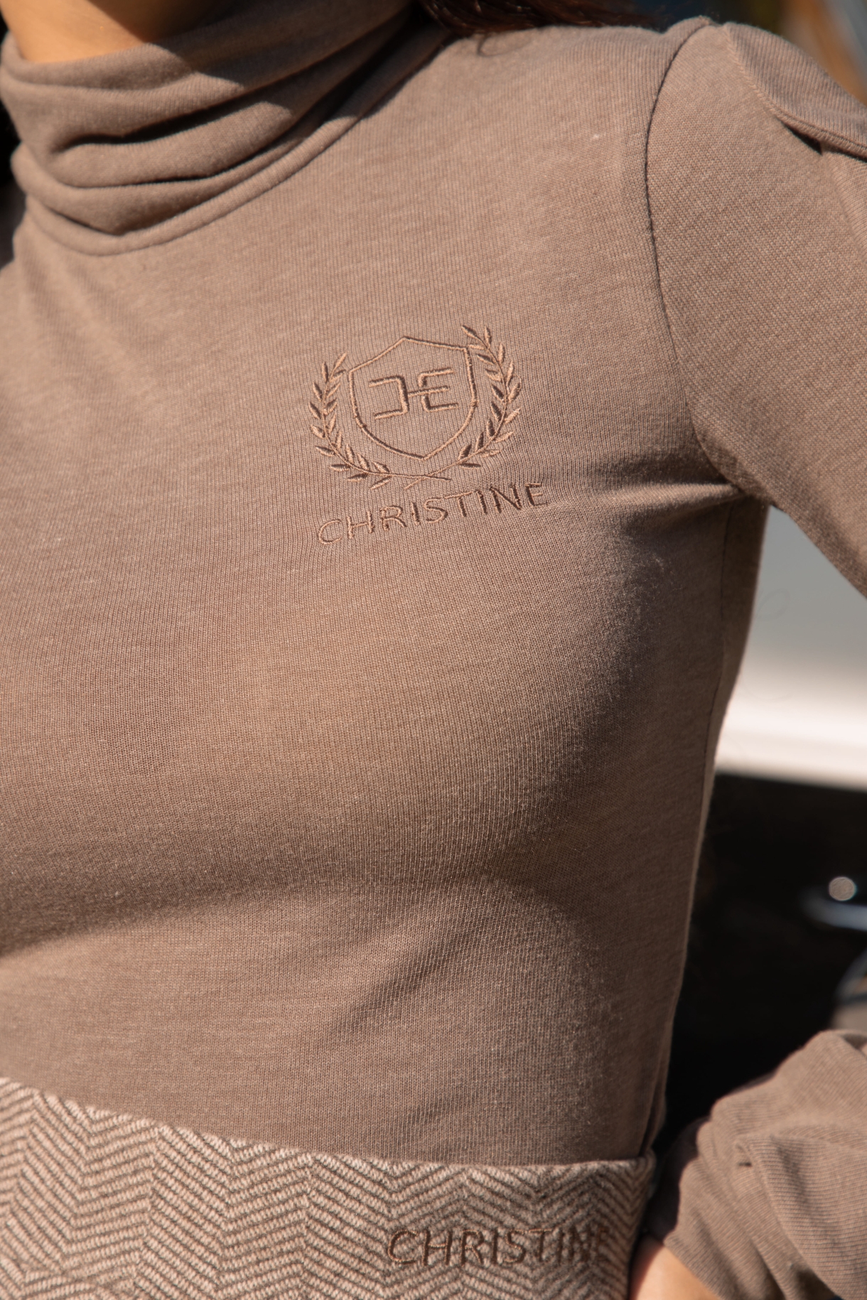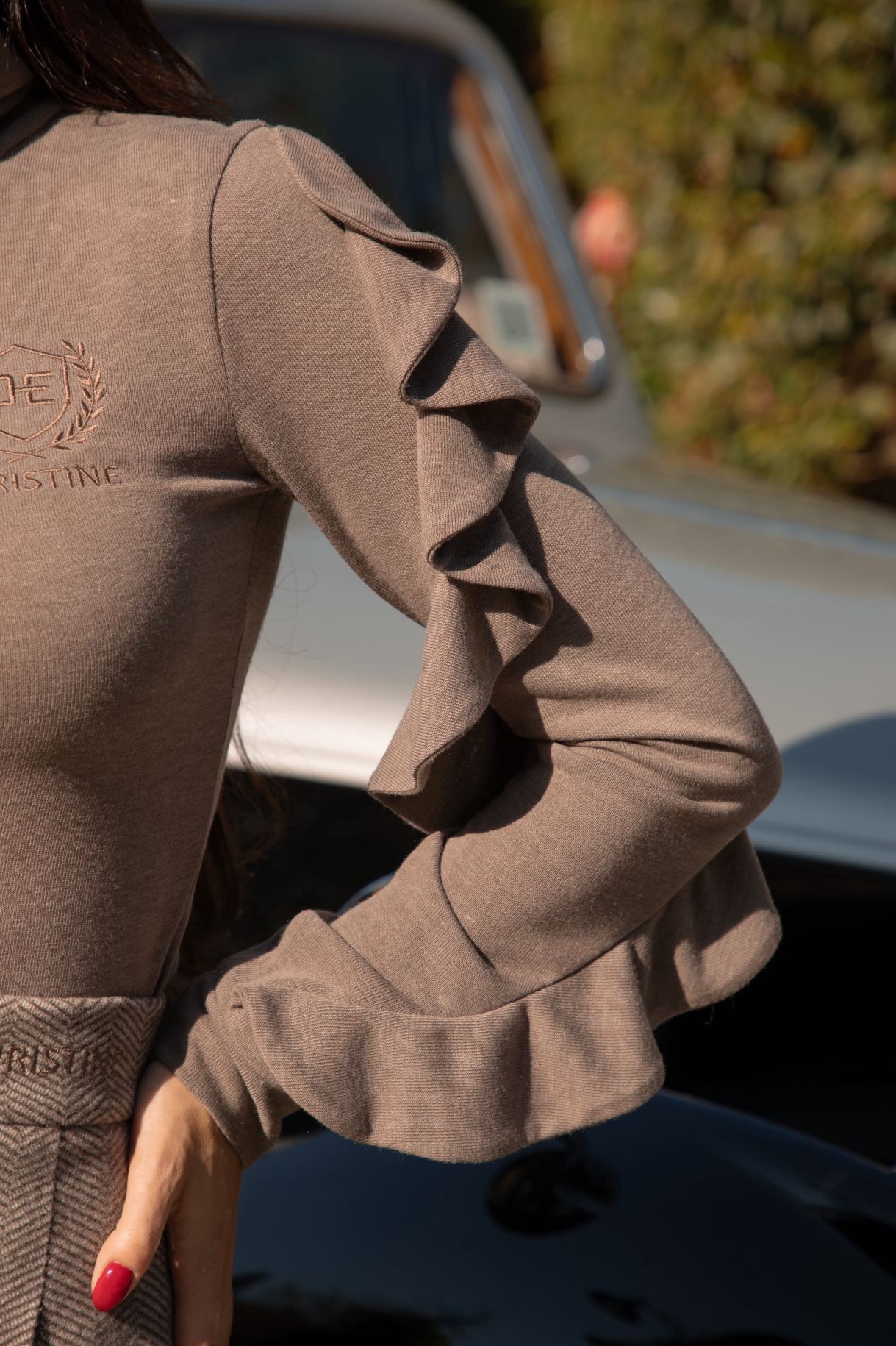 Бежово поло с дълги ръкави с ефектни двойни къдри по ръкава и кафява бродерия CHRISTINЕ в предната част. Моделът е изработен от меко, фино и топло плетиво.