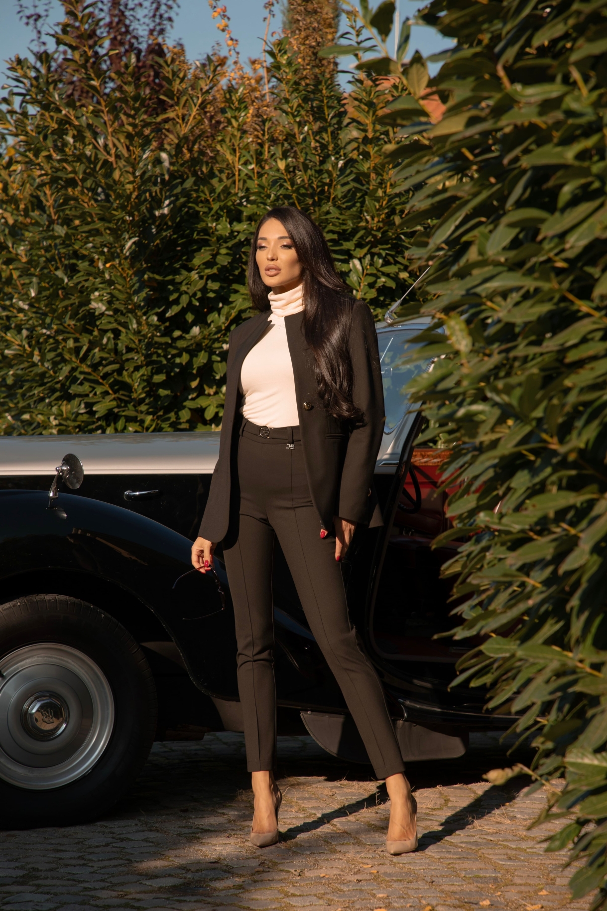 Панталон в тъмнокафяво с висока талия и ръб с машинен бод, изработен от плътна материя с лека еластичност. Моделът е с гайки, закопчаване в страничната част със скрит цип "YKK", висулка с лого и колан от основния плат с метална златиста тока с лого CHRISTINE.