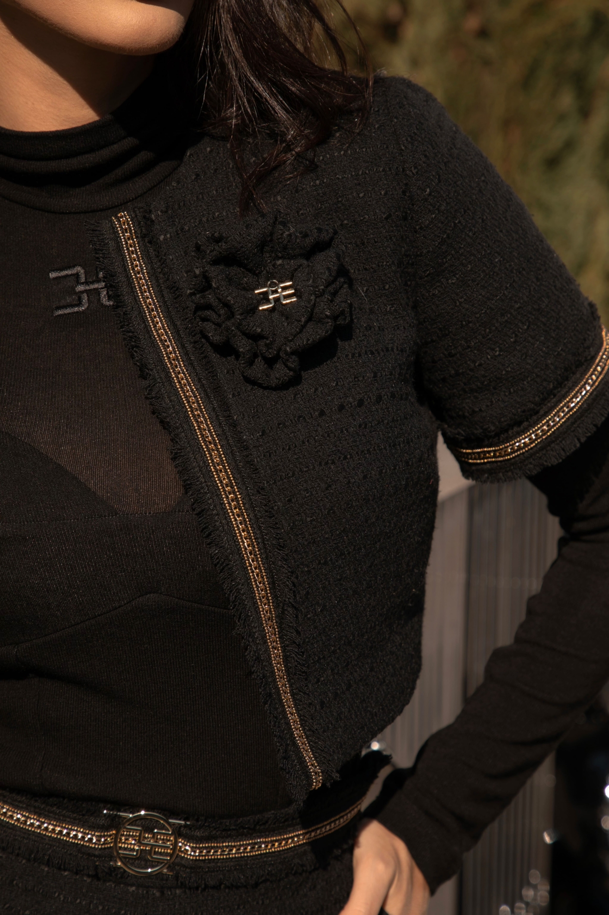 Блузка тип сако, изработена от плътно и нежно букле в черно. Моделът е с къс ръкав и закопчаване в предната част със скрито копче. Моделът е декориран в предната част и на ръкавите с ефектна лента с разнищен ефект и златиста верижка. Блузката е с ръчно изработена брошка от основния плат с метална златиста висулка с лого.