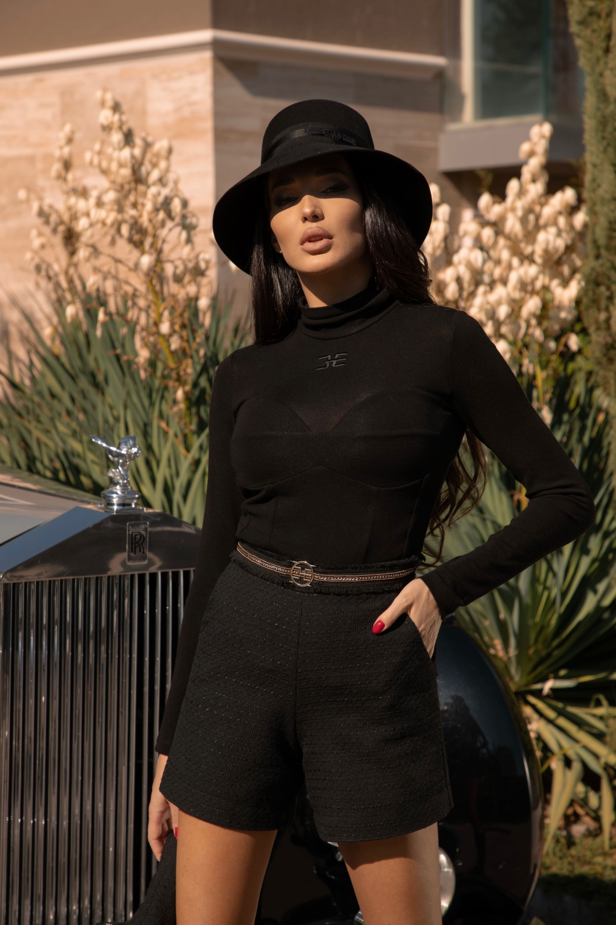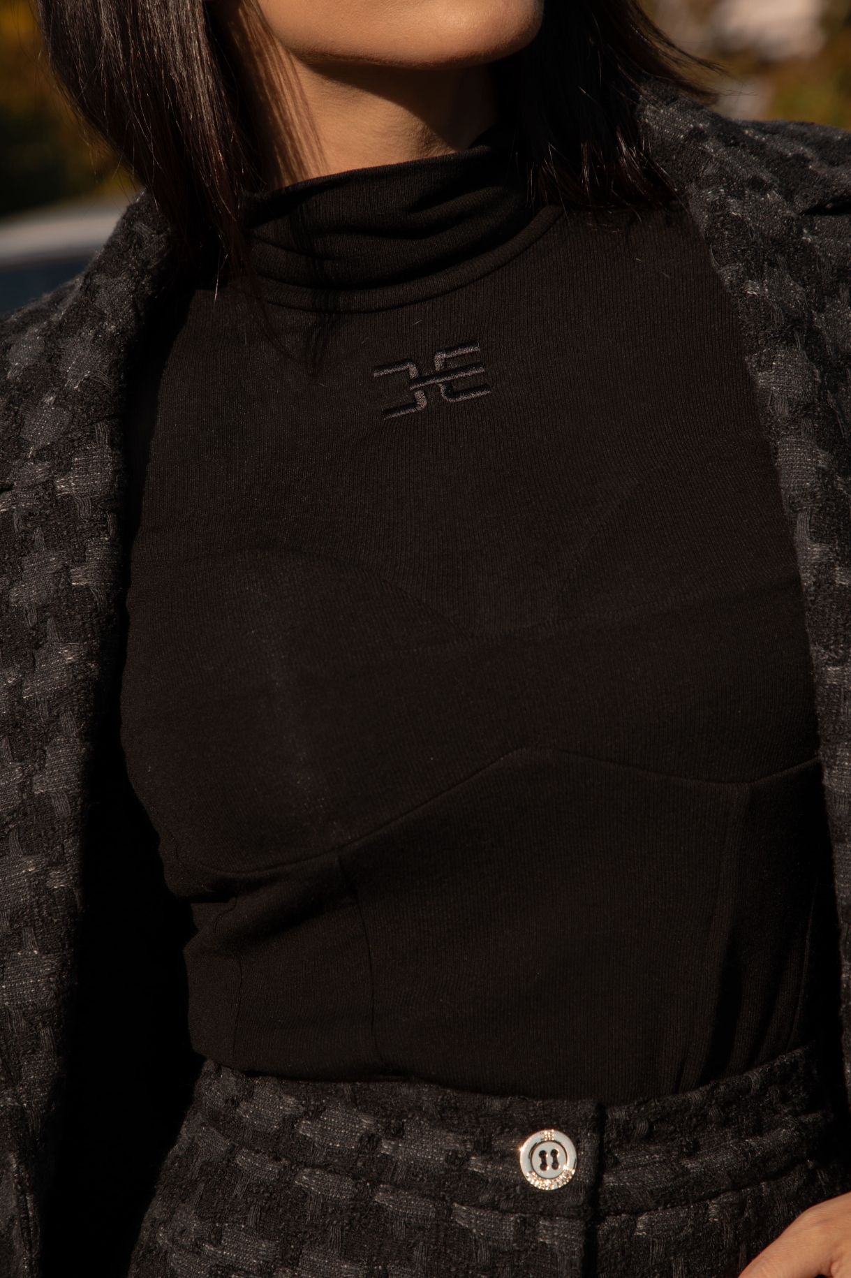 Поло в черно с нежна CHRISTINE бродерия в предната част и ефектен оформящ силует тип "бюстие". Моделът е изработен от фино и нежно плетиво. Полото е с дълъг ръкав и е изцяло двойно изработено в предната част на "бюстието" и талията.