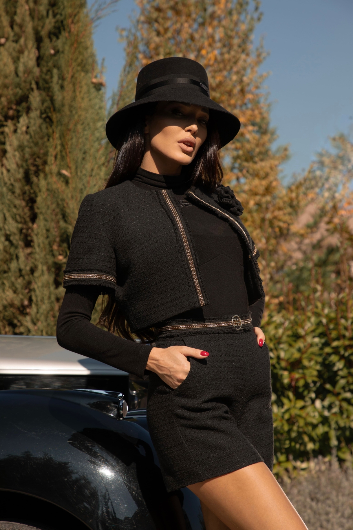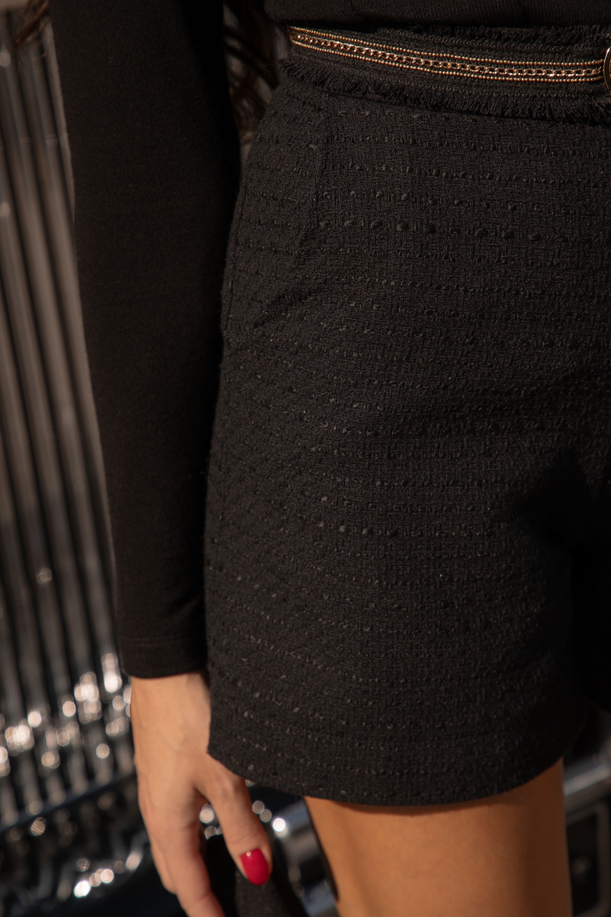 Къси панталони в черно с висока талия, изработени от плътно и нежно букле. Моделът е декориран на талията с ефектна лента с разнищен ефект, златиста верижка и метална златиста тока с лого CHRISTINE. Закопчаване в задната част със скрит цип "YKK".