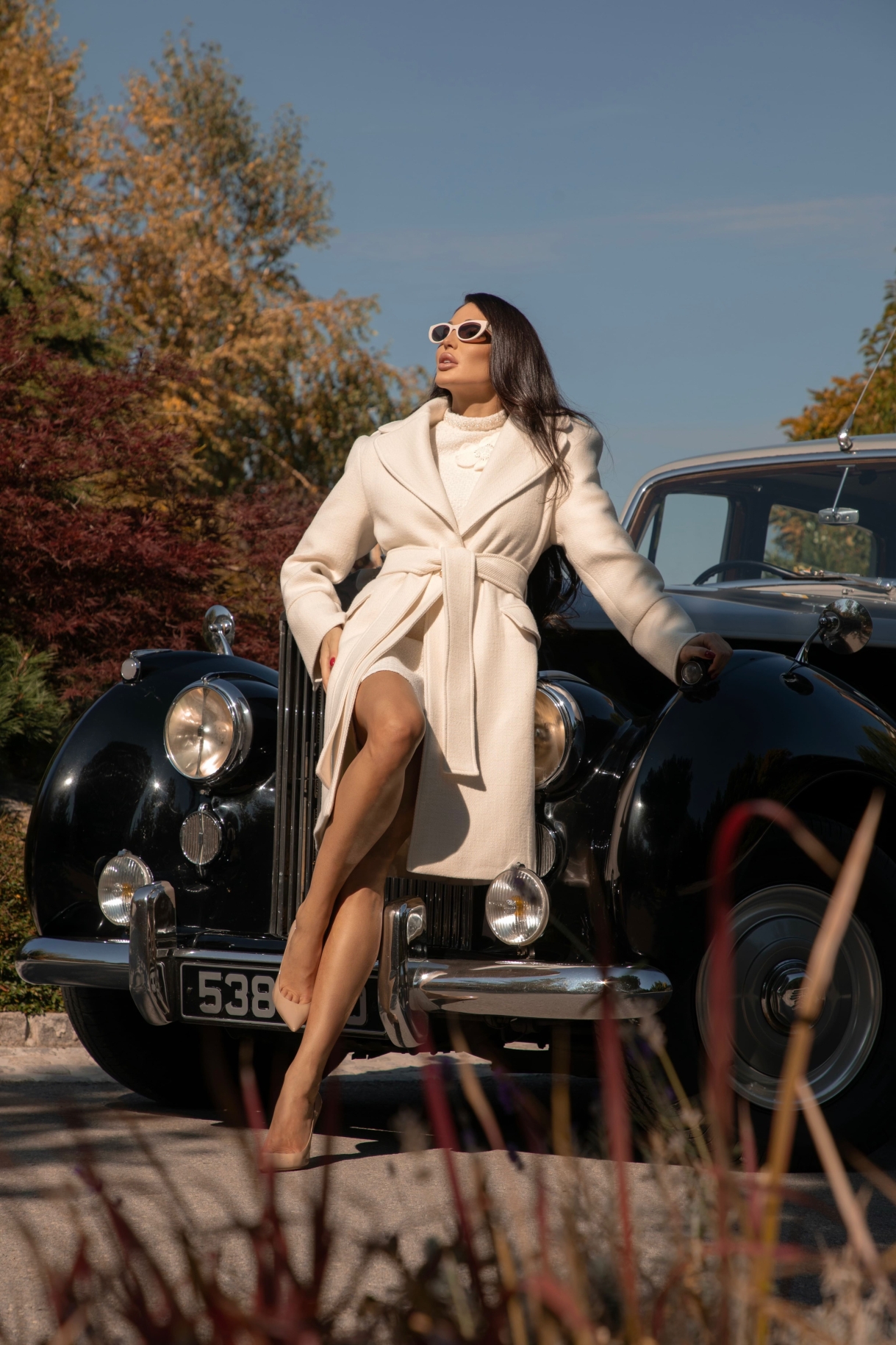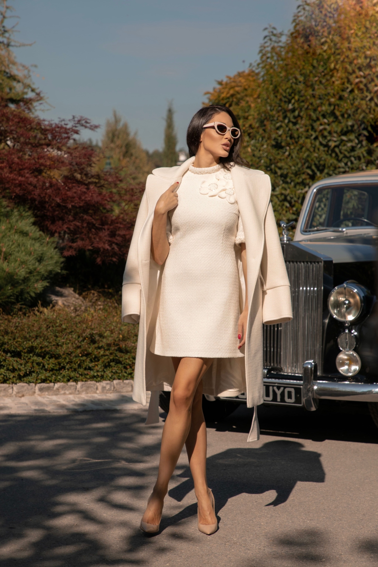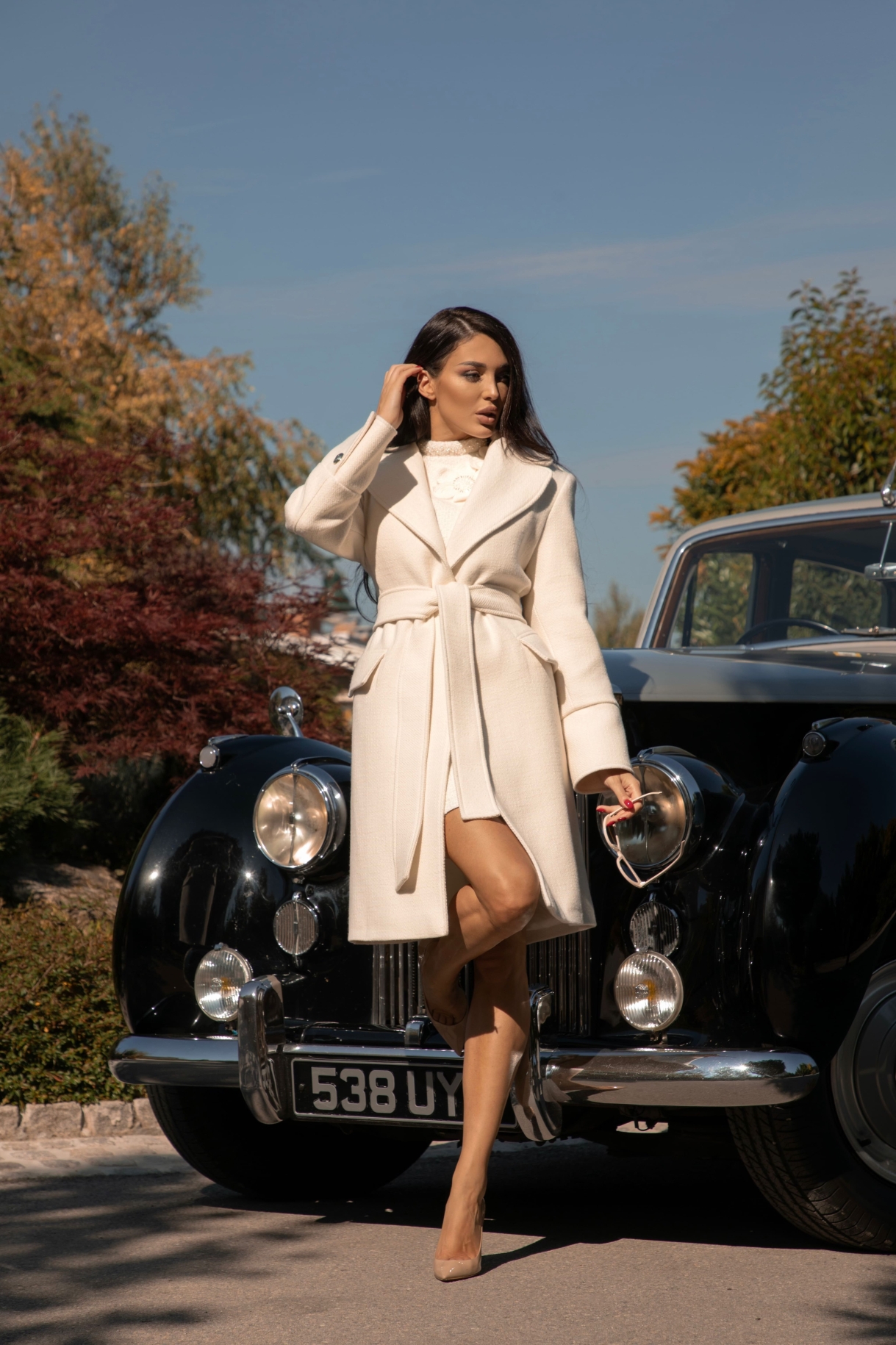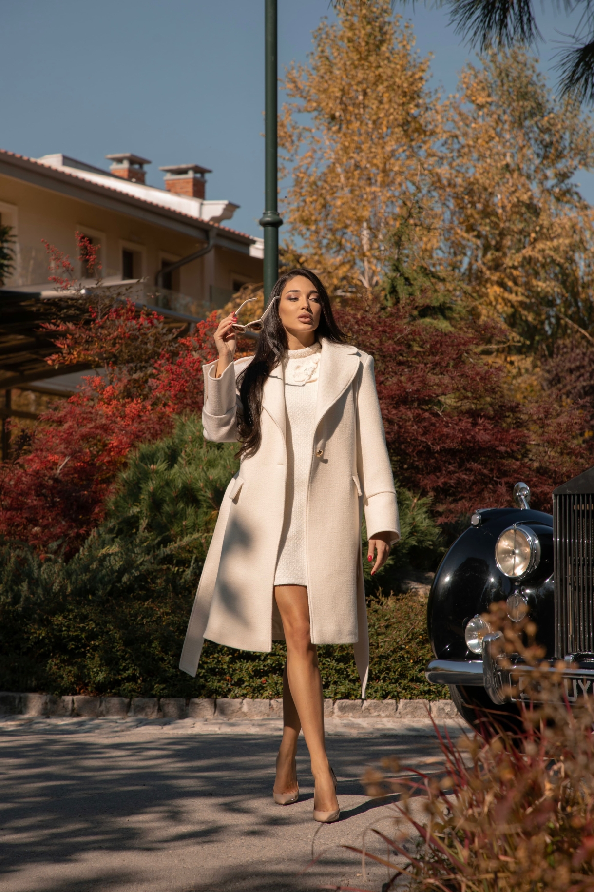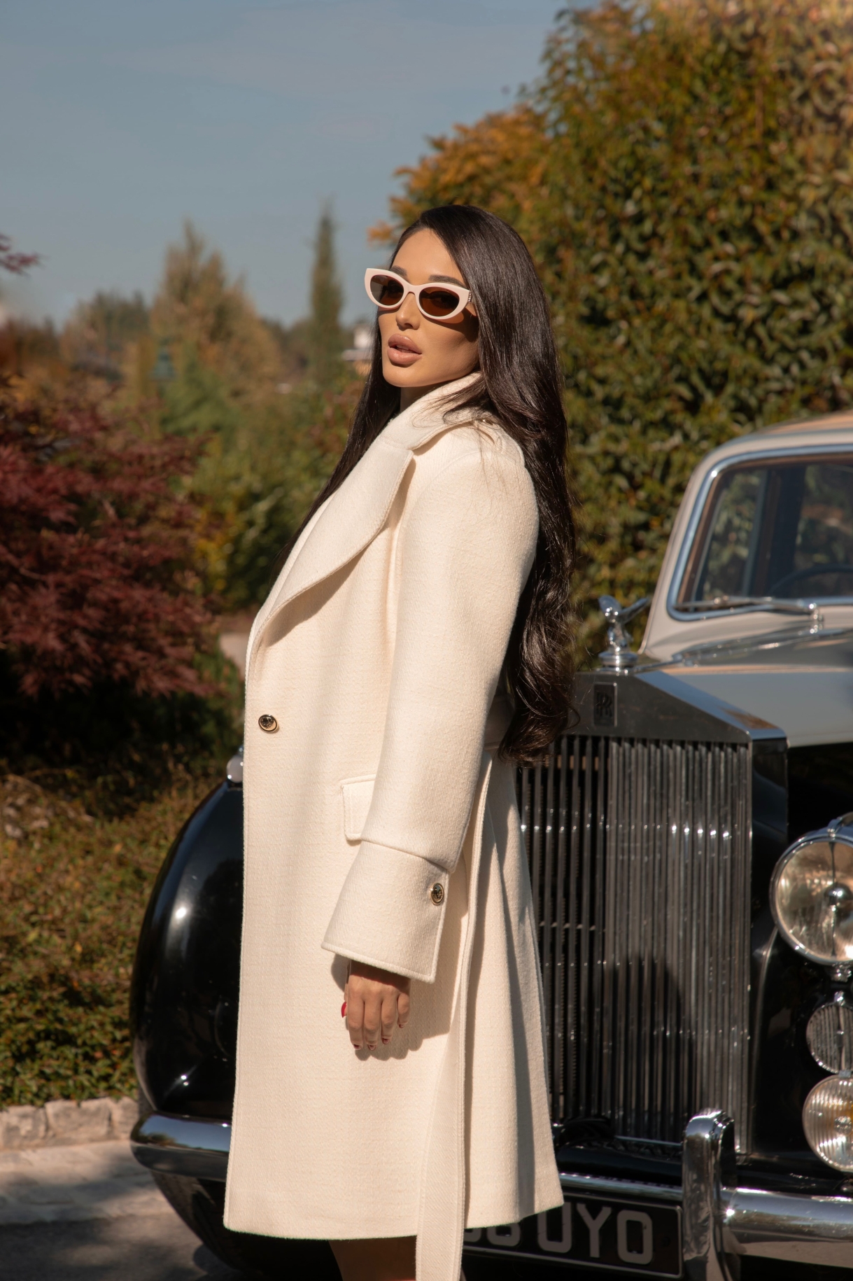 Дълго палто в бяло, изработенo от висококачествена, плътна и мека италианска вълна с луксозна брандирана подплата. Моделът е с ревери, ефектни рамене, щривки с копчета на раменете, шлиц в задната част и джобове с капаци. Палтото е с едноредно закопчаване в предната част, отворен шлиц на ръкава и метални копчета в златисто с лого. Моделът е с гайки и колан изработен от основната материя.