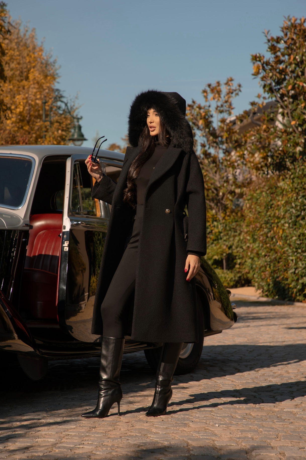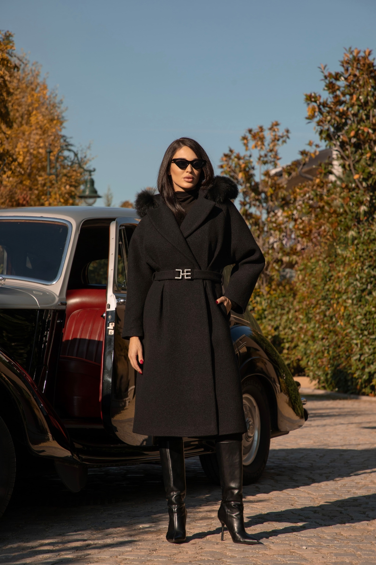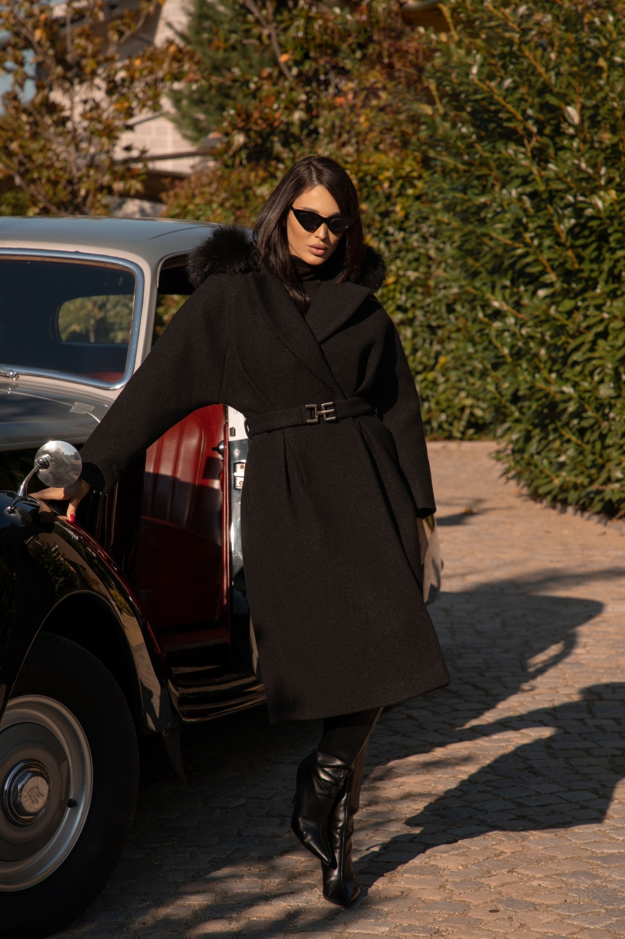 Дълго палто в черно със свободен силует, вталяване в талията с плохи, ревери, джобове и двуредно закопчаване с метални златисти копчета с лого. Палтото е с ефектен колан от основния плат, чиято двойна структура на металното златисто лого CHRISTINE се среща и приляга безупречно при закопчаването. Моделът е със сваляща се качулка с косъм от естествена кожа и може да се носи по два начина. Изработенo е от плътна и мека италианска вълна и луксозна брандирана подплата.