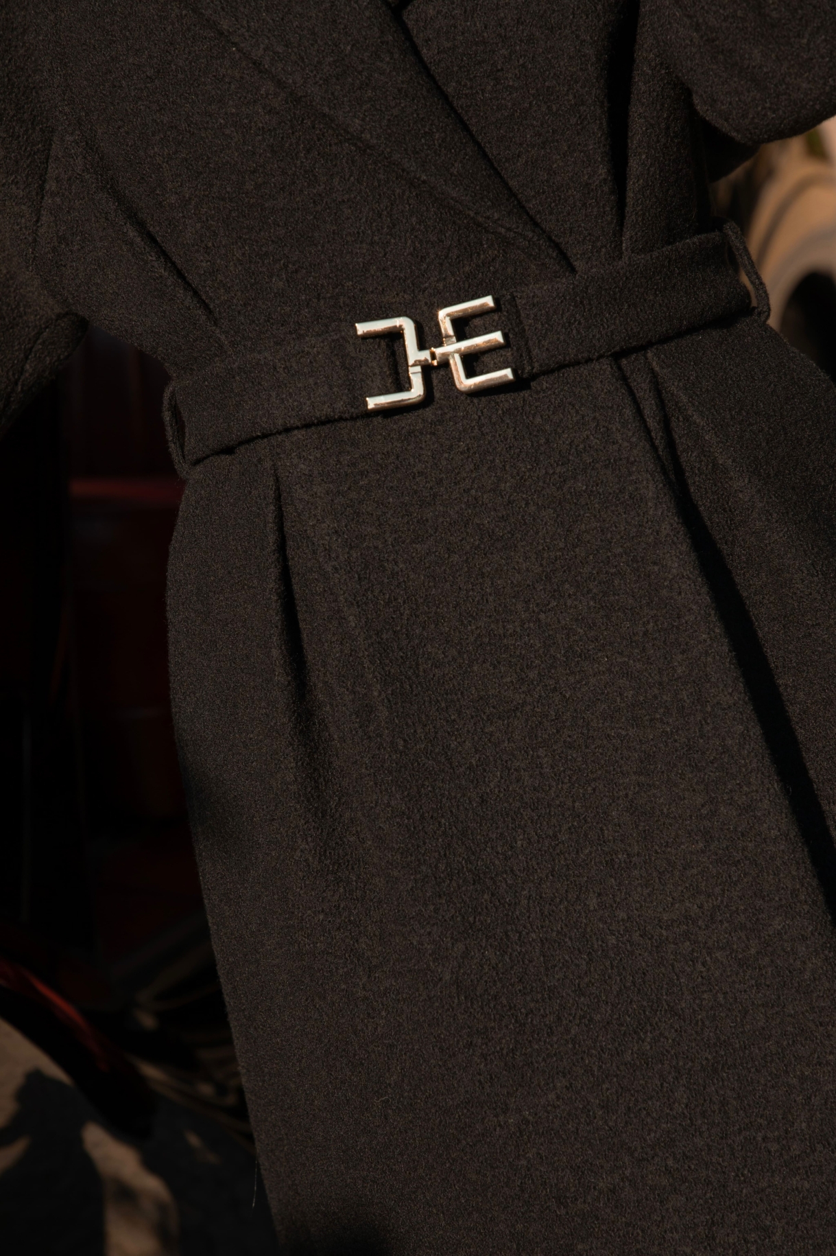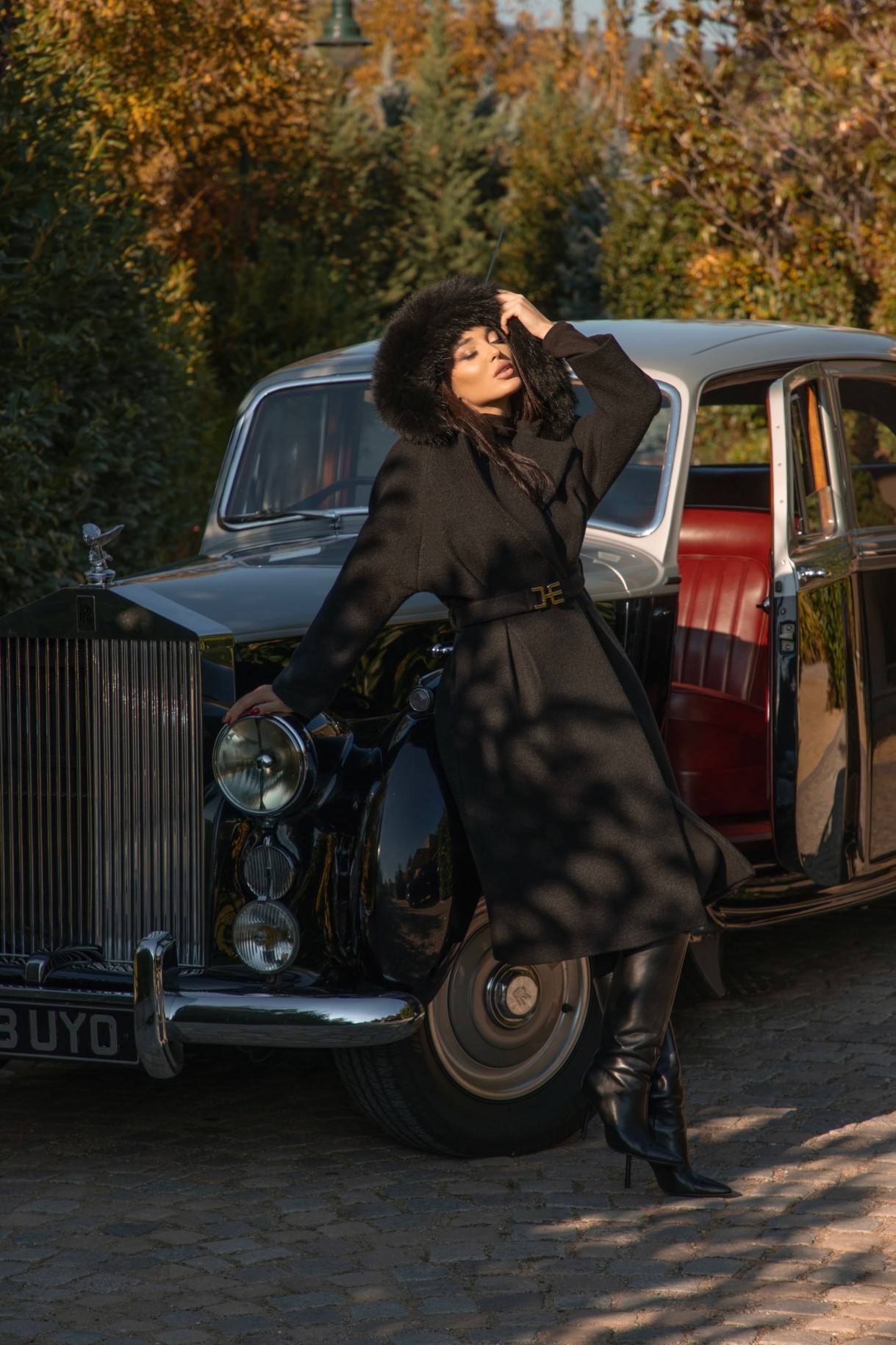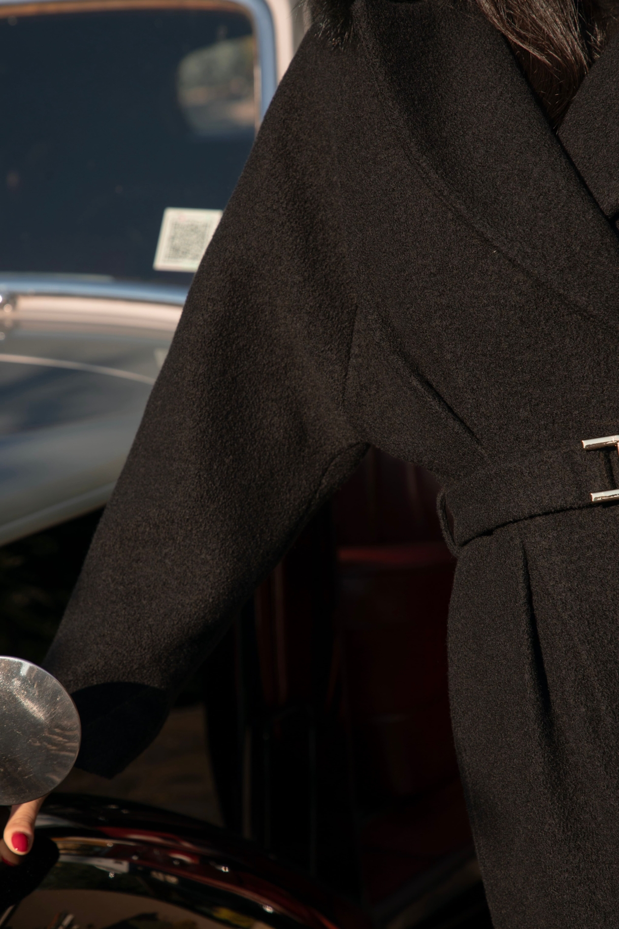 Дълго палто в черно със свободен силует, вталяване в талията с плохи, ревери, джобове и двуредно закопчаване с метални златисти копчета с лого. Палтото е с ефектен колан от основния плат, чиято двойна структура на металното златисто лого CHRISTINE се среща и приляга безупречно при закопчаването. Моделът е със сваляща се качулка с косъм от естествена кожа и може да се носи по два начина. Изработенo е от плътна и мека италианска вълна и луксозна брандирана подплата.