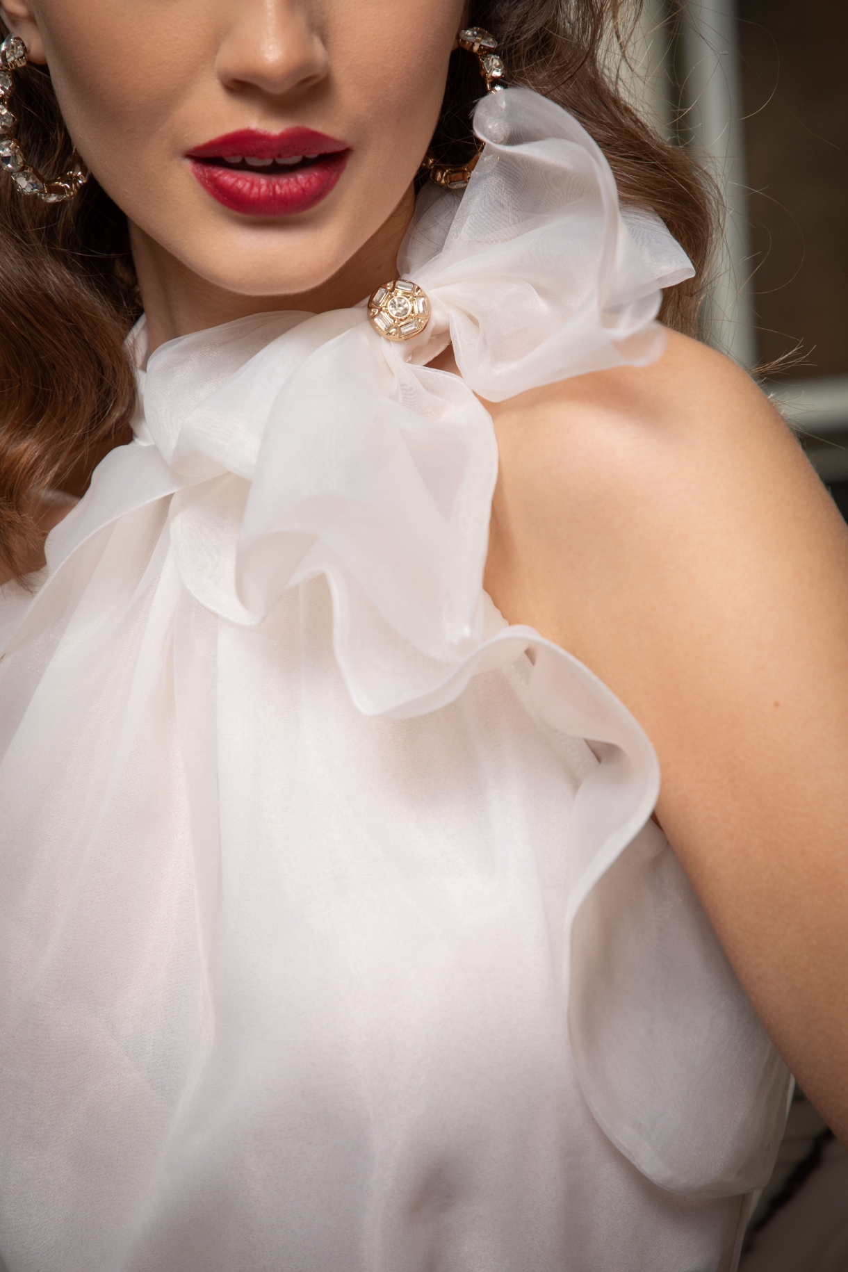 Топ в бяло, изработен от нежна органза, изцяло подплатен с нежен хастар. Моделът е с ръчно изработена брошка - пандела от основния плат с кристален камък. Топът е със свободен силует, и ефектни двойни къдри в предната и задната част.