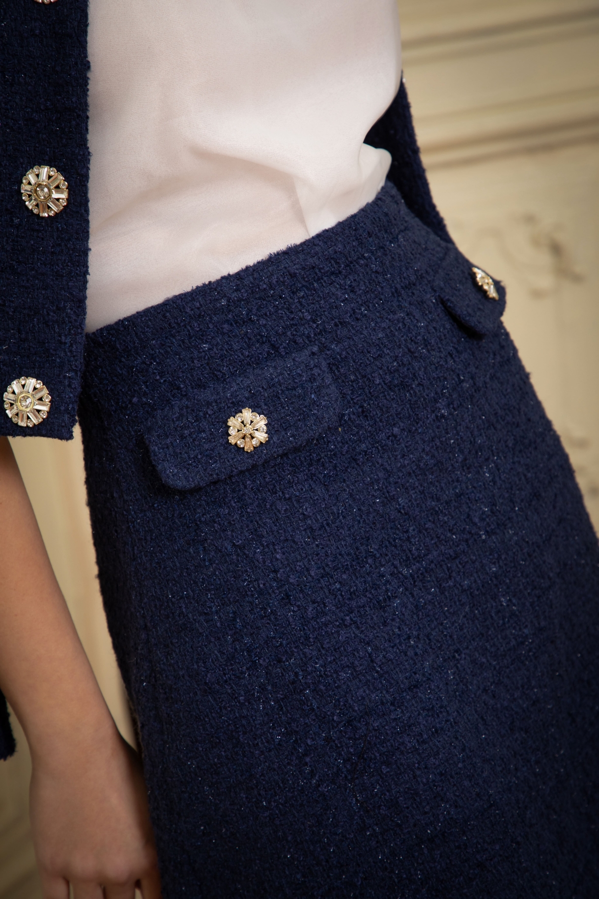 Пола в тъмносиньо, изработена от букле с фина бляскава нишка и нежна и фина подплата. Моделът е с висока талия и декоративни капаци с ефектни метални златисти копчета с кристални камъни. Закопчаване в задната част със скрит "YKK" цип.