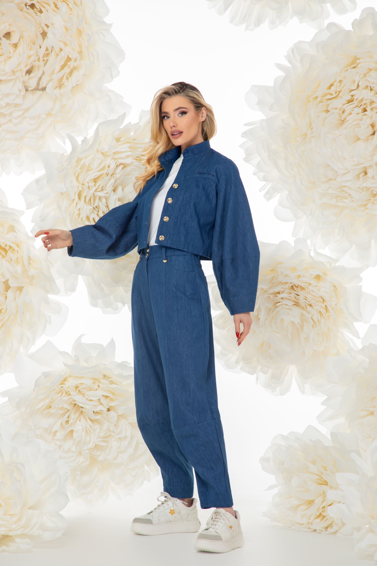 Късо яке в тъмносиньо, изработено от дънкова памучна материя, изцяло подплатено със сатенирана брандирана подплата. Моделът е с ефектни ръкави, сърцевидно деколте с бродерия CHRISTINE, яка и закопчаване със златисти метални копчета.