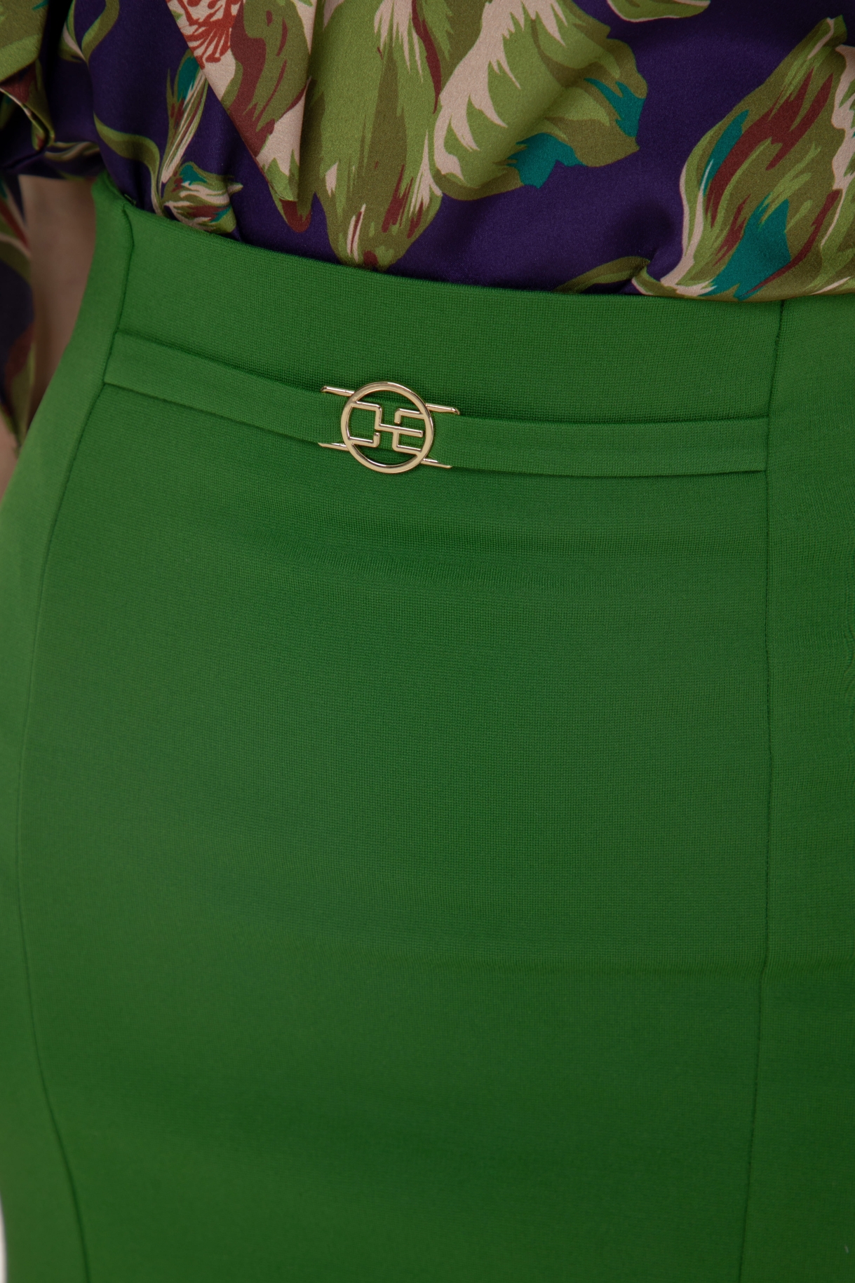 Пола в зелено, следваща извивките на тялото, изработена от еластична плътна материя. Моделът е с декоративен колан от основния плат със златиста тока с лого. Полата е с шлиц в задната част и закопчаване със скрит "YKK" цип.