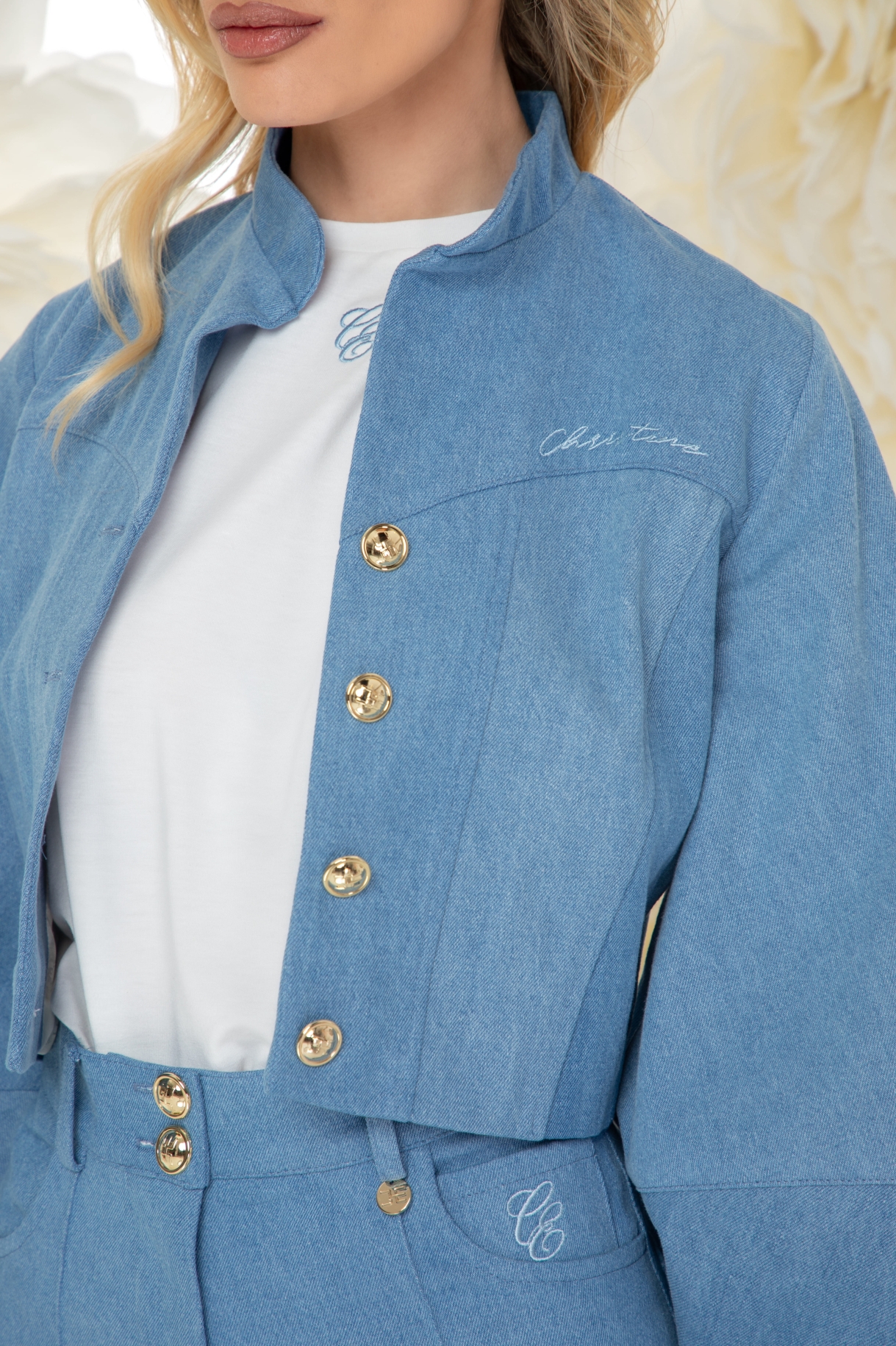 Тениска в бяло с нежна CHRISTINE бродерия в светлосиньо, изработена от нежен и плътен висококачествен памук с еластичност. Моделът е с къс ръкав с маншет и свободен широк силует. Тениската е декорирана на ръкава с метална плочка с лого CHRISTINE.
